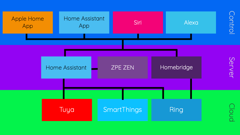 This diagram describes the interaction that takes place. I have two bridges for Apple HomeKit; the Home Assistant and Homebridge installations running on my home server. All devices now communicate through Home Assistant or Homebridge, and whilst this diagram doesn't really show it, Alexa, for example, must communicate through my Home Bridge cloud instance. This is why I now prefer Siri to Alexa in my house and will likely phase out my Echo ecosystem in favour of the Apple Homepods.