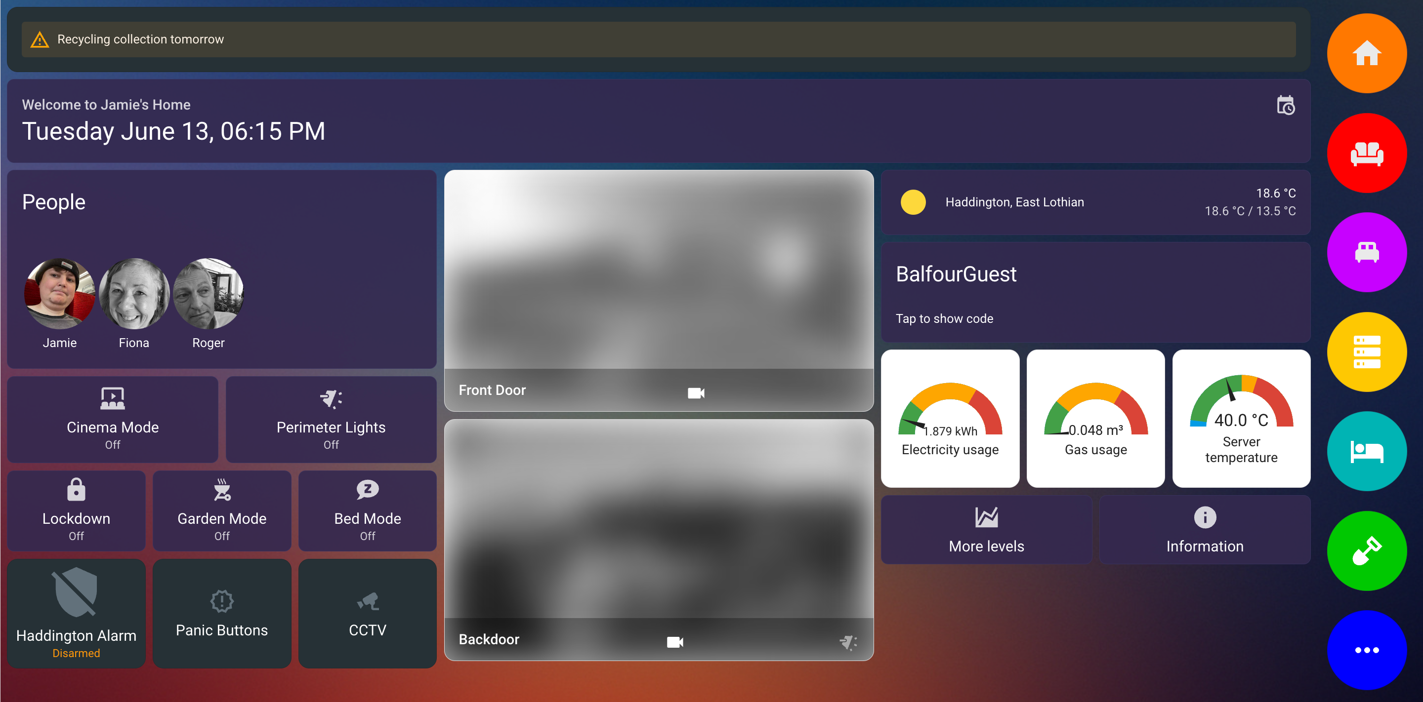 This is the UI of the front screen interface that is in my hallway. This is currently running on an iPad, but will soon be powered by a dedicated display that will be used for this purpose alone. The guest bedroom will also soon have its own interface which will allow control of the temperature (when I get Hive installed), the lighting in the room as well as the plugs in that room.