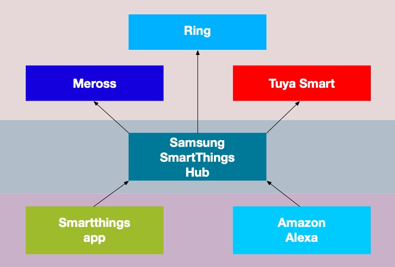 The system works by having no communication between Amazon Alexa and the Meross or Tuya Smart devices - there is another layer of abstraction added, the SmartThings Hub. This is the control centre. This is also how my IFTTT commands are processed - by communicating directly with my web server, which then talks to the hub and deals with the rest.