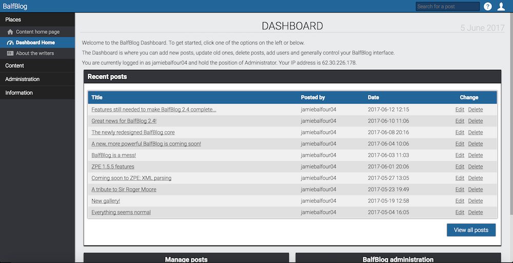 I'm also astonished to say that it's changed internal a huge amount. 2.4 and 2.5 aim to make the system more powerful, but in terms of features, since I first released 2.3, it has come a long way. The interface has been modified to make it more flexible on mobile and desktop, it now features glyphs on the options, a new help feature, a more powerful API and much more Ajax support. The UI focuses more on a blue look, something taken from my own website but has become a staple part of the BalfBlog interface.