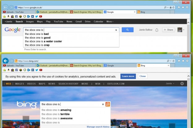 Google users search more for why "the Xbox One is bad" and Bing users search for why "the Xbox One is amazing".