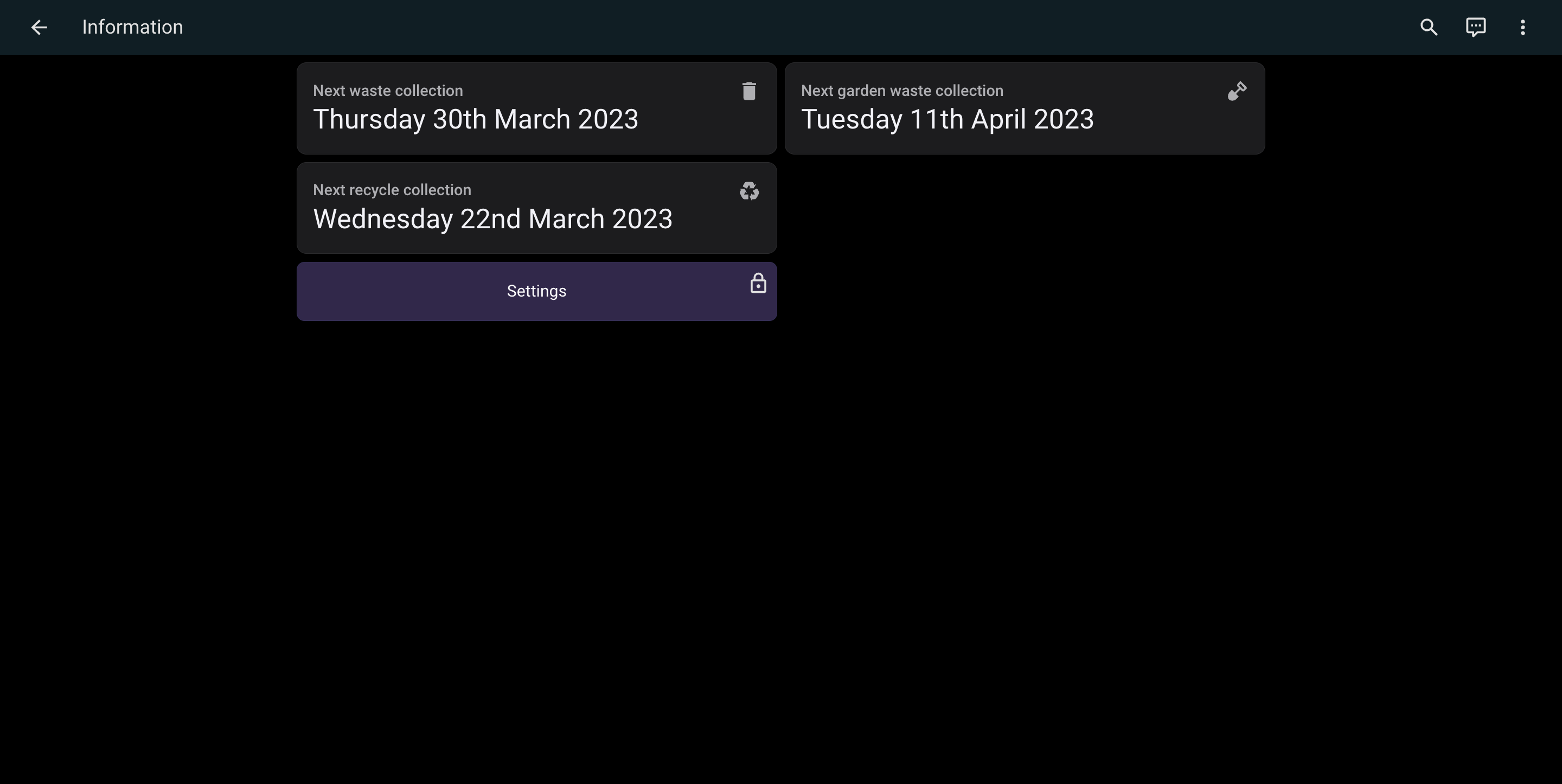 One of the latest things that I have managed to do is add information about bin collection to my tablet (not the easiest thing to do since my council doesn't use JSON data for this so instead I needed to use XPath to read the HTML of the page and find the data manually, translate it to JSON and read it using my Home Assistant installation). Currently, all that happens with this is it displays a warning at the top of the tablet as to what bins (if any) are to be put out that day.