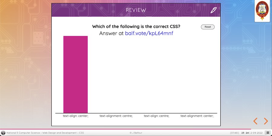 BalfVote is my latest addition to my WISP. Developed in a couple of hours, I developed a tool that I want to use in my classroom. Since I have already moved away from using Google Slides and to slides.com, which gives you much more granuallar control over the HTML and CSS on the pages, I have already made the change to a more consistent set of slides - all hosted on my website. I have also been creative with my interactivity in my lessons, for example in one lesson the pupils must provide the correct answer and when they do, the text box highlights green, whereas if they get it wrong it goes red. Other lessons have timers built-in to them, or quizzes built with BalfQuiz and much more. By having the ability to embed iframes and HTML I can do anything I want.