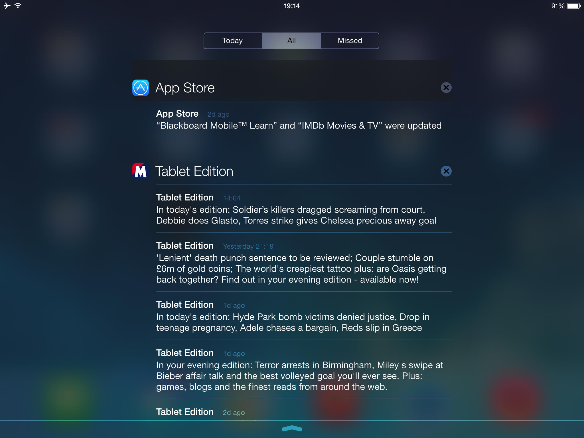 iOS 7 is different to iOS 5 that I have on the original iPad in so many ways. Apple have finally decided on some crucial things, but that is not for this article. I will swiftly point out the differences between the way the Notification Center works because it looks much better. In iOS 5 the Notification Center dropped down the middle of the screen only filling the middle about the width of the iPhone. With iOS 7 they chose to make it full screen, a massive change and something that many will like.