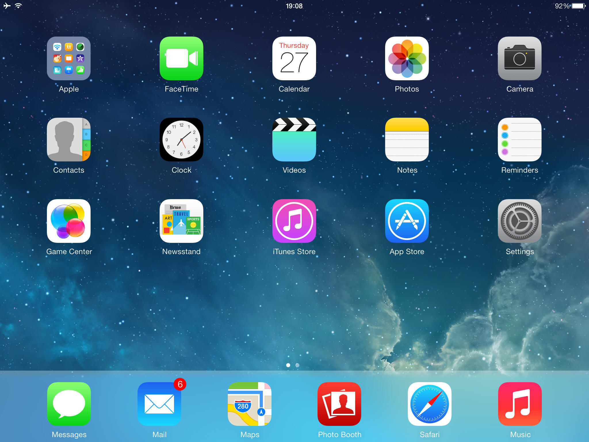 Parallax is an excellent new feature brought to iOS 7. The concept of parallax is that things kind of move. For iPad this is your Home screen background, which moves as you tilt the device around. It gives the user a false sense of the operating system's user interface actually being in the real world, rather than in a computer system. It's nice and it's a good proof of the performance of the iPad. Here are two images where the parallax effect makes a difference to the way the background looks. It's nice, but not entirely necessary. Use the stars to see what I mean.