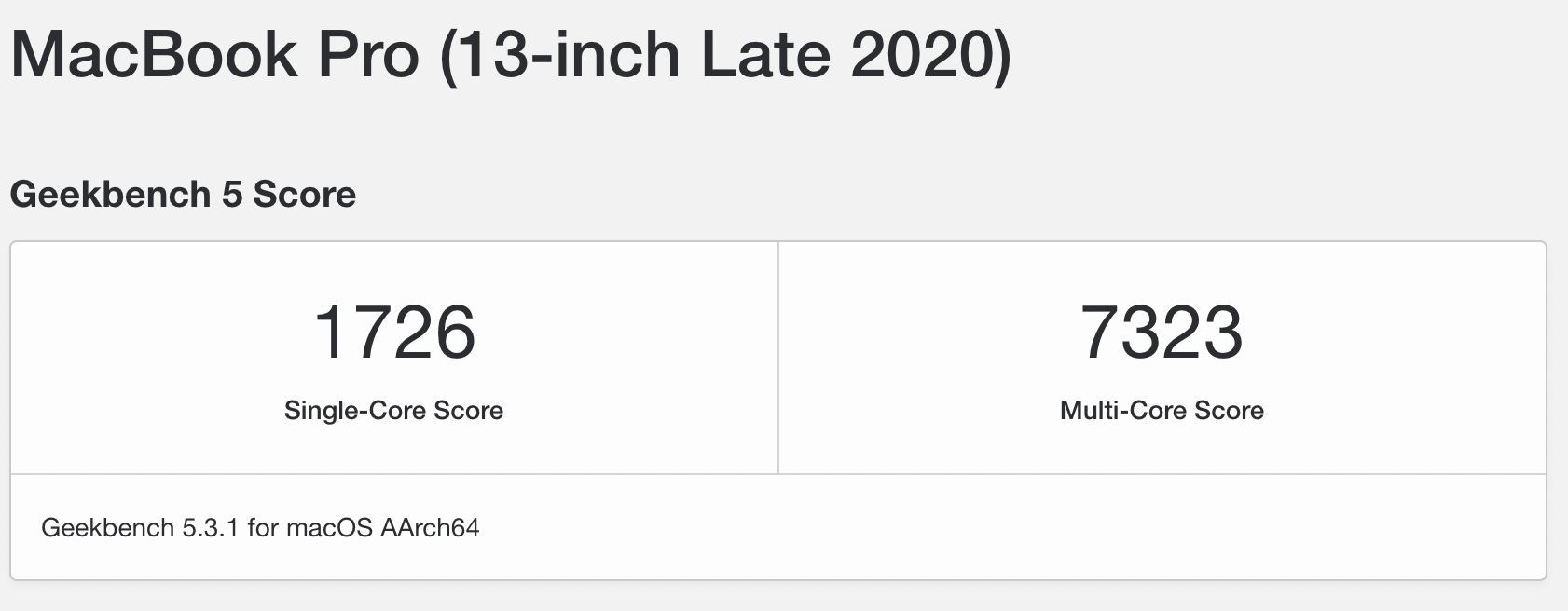 And boy is it fast. Not only is it fast but it's power efficient. In fact, after using this new MacBook Pro for just under a week I haven't heard the fans ramp up once and the laptop has been completely silent the whole time, even when I ran the GeekBench 5 on it to try and get the fans spinning. Below are the results of GeekBench 5 for this MacBook: