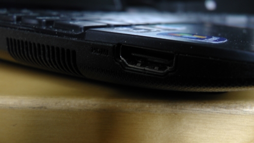 On the left you will find a power jack, VGA port, one USB 2.0 port and a very nice HDMI port.