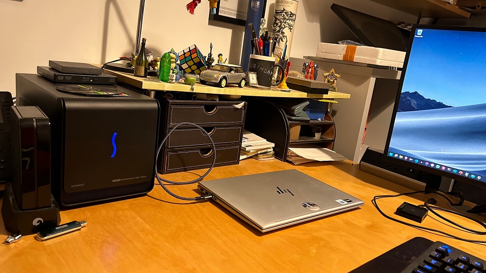 I personally have used this coupled with an RX 5700 graphics card that I have removed from my desktop in order to allow me to play high-end demanding games on this machine when it returns home. My setup is fairly standard: I have an eGPU box that connects my monitor, keyboard and mouse to my laptop, and a second DisplayPort connector on the GPU connects to my TV downstairs, in my bedroom and in my office through UTP to HDMI cabling. All of this is possible thanks to Thunderbolt on my laptop and this is something I've wanted for a long time.