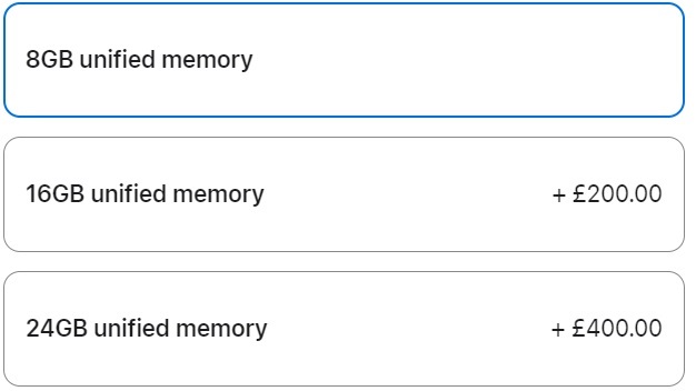 Continuing on this trend is the memory of the computer. Apple's unified memory architecture is considerably better than the competitor, DDR5, which can only achieve 64GBps random access compared with Apple's 150GBps. I mean, this is great, and it leads to a smooth workflow when using Apple's hardware, but it does come with a big caveat in that it cannot be replaced. This means when you buy the machine, you are stuck with the memory you bought and cannot increase the size later. This would be fine if the memory wasn't so expensive to upgrade when you buy the machine. The base model with its 8GB of memory might not be enough today, and most people will consider the 16GB of unified memory. This adds £200 to the price of the computer. Want more? You can also get an additional 8GB for another £200. Compare this to the EliteBook I upgraded, where I got 64GB of DDR5 RAM for £200.