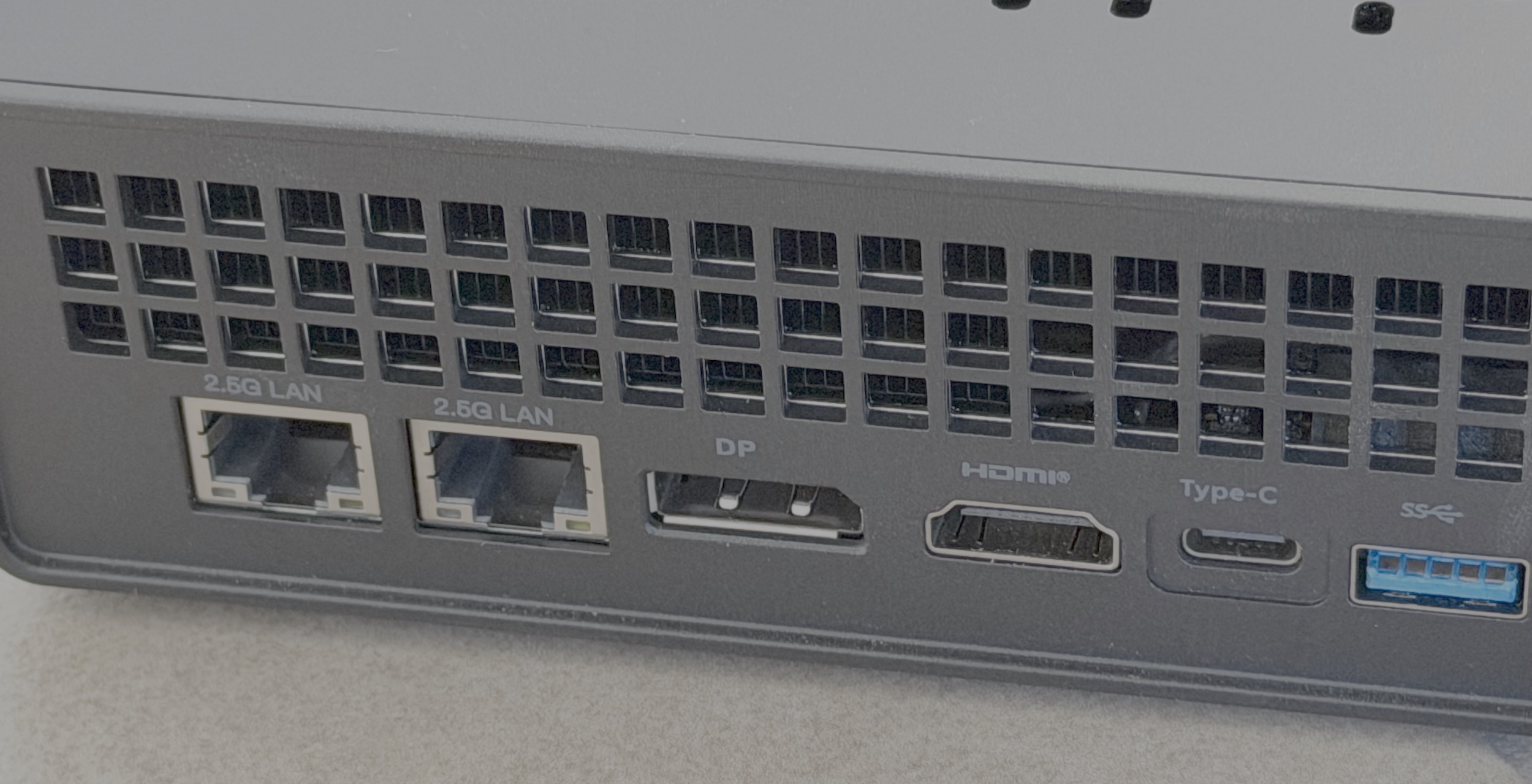 Next, let's take a look at this device's networking capabilities. Given its two 2.5 GBASE ports, 5 Gbps of networking capability can be achieved through connection aggregation. The Intel MS-01 features two SPF+ connectors, allowing for 10Gbps networking per port and 20Gbps of aggregated bandwidth; however, 5Gbps will be more than enough for most users. I recently upgraded my network to 2.5 Gbps on switches with a 10 Gbps backbone because my new 1.6 Gbps broadband package saturated the 1 Gbps network I had before. This will soon become the norm.
