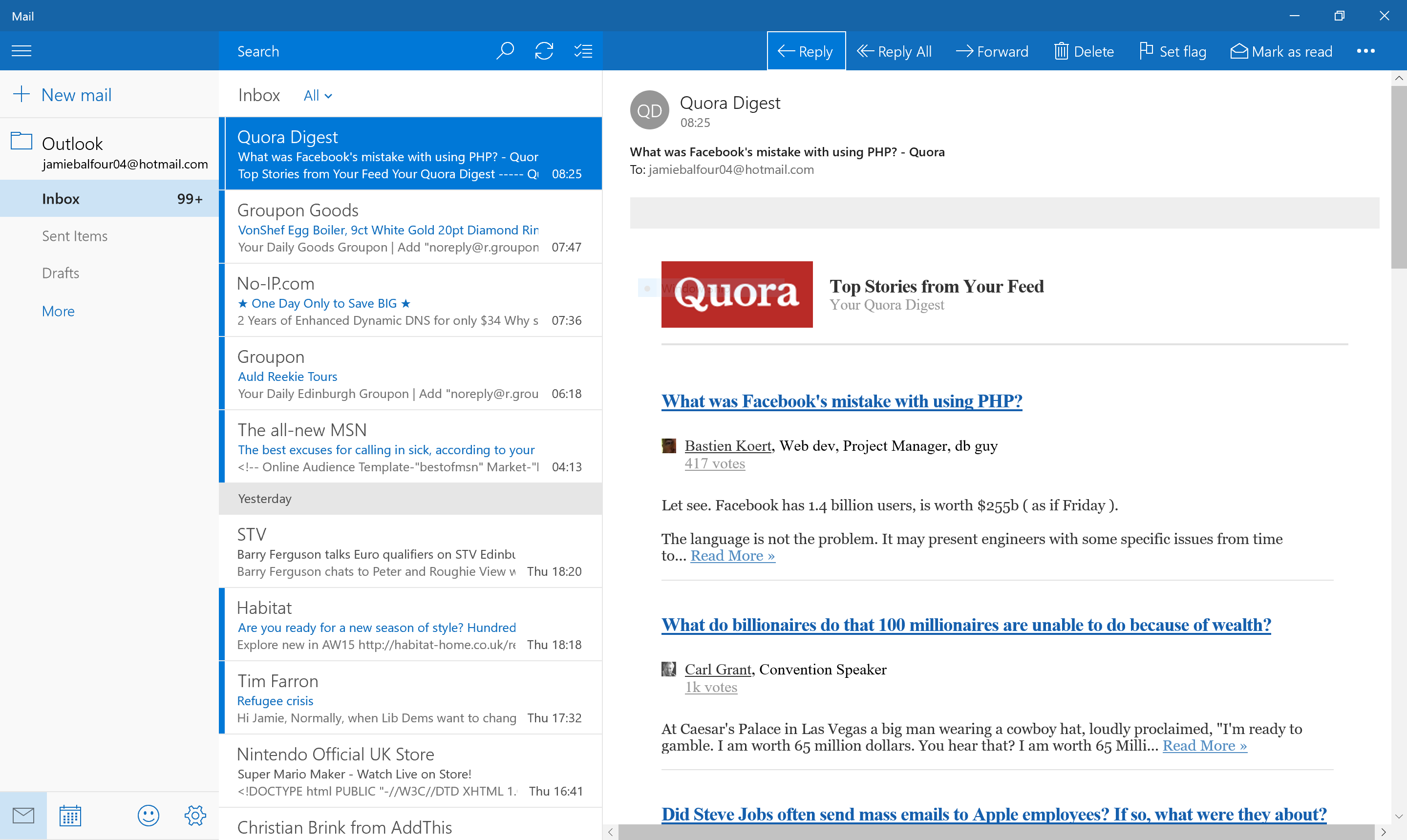 Mail is one of those 'modern apps' that integrates nicely into Windows 10 in the change from Windows 8.