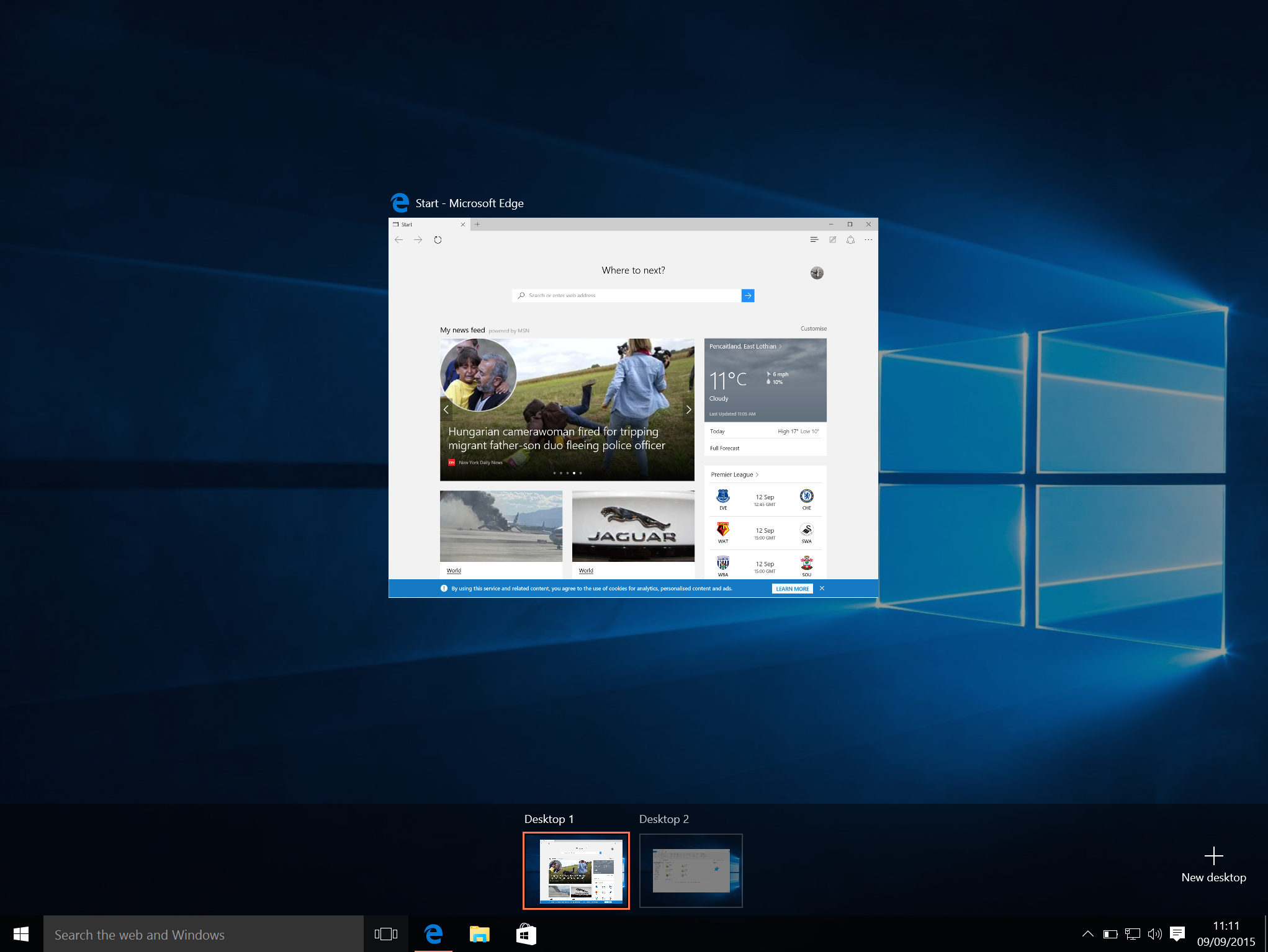 The new desktop switcher can be activated by clicking the button at the bottom left next to Cortana or by pressing the Windows + Tab buttons (this used to enable Aero Flip3D in the days of Windows Vista and 7).